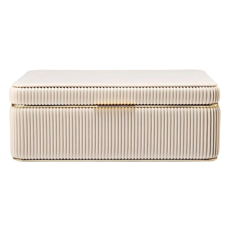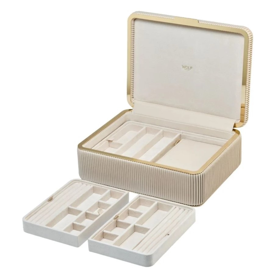 The Bella jewelry box impresses with its exquisite elegance and thoughtful design. Its smooth vegan leather lid and perfectly pleated sides blend harmoniously with golden interior accents and hardware. Inside are three removable trays lined with innovative LusterLoc™ fabric, offering 16 compartments for necklaces, rings, bracelets, and earrings, as well as a spacious open section for storing larger pieces. Completing the design is a detachable vegan leather cosmetics case with four individual pockets, ensuring secure and organized jewelry storage.
