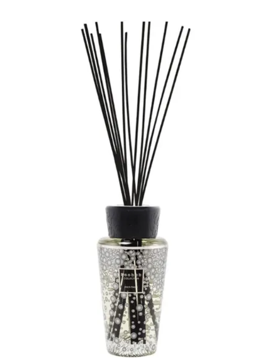 The Black Pearls home fragrance diffuser is covered in a silkscreen pattern of black pearls and platinum. Through the glass you can see an engraved dome with a root pattern that matches the black bakelite cap.