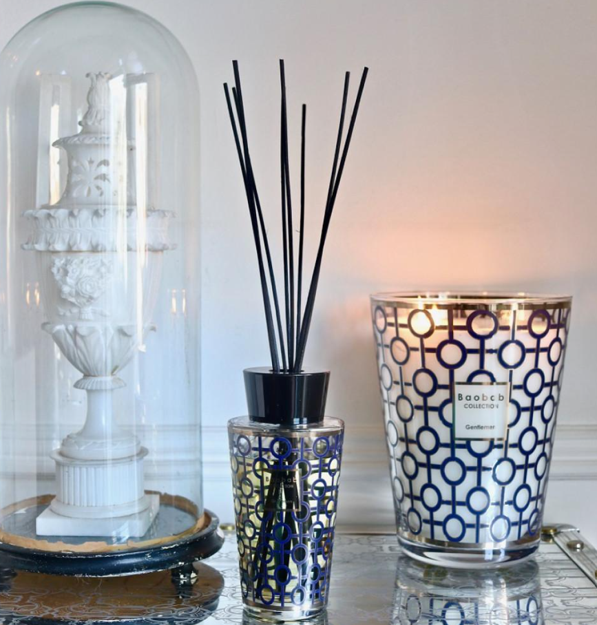 The Gentlemen diffuser is silk-screened in platinum and features navy blue patterns. The bottle is topped with a black bakelite cap with an engraved root design. The pattern on the bottom of the bottle with the same motif, visible through the clear glass, gives the product a sophisticated look.