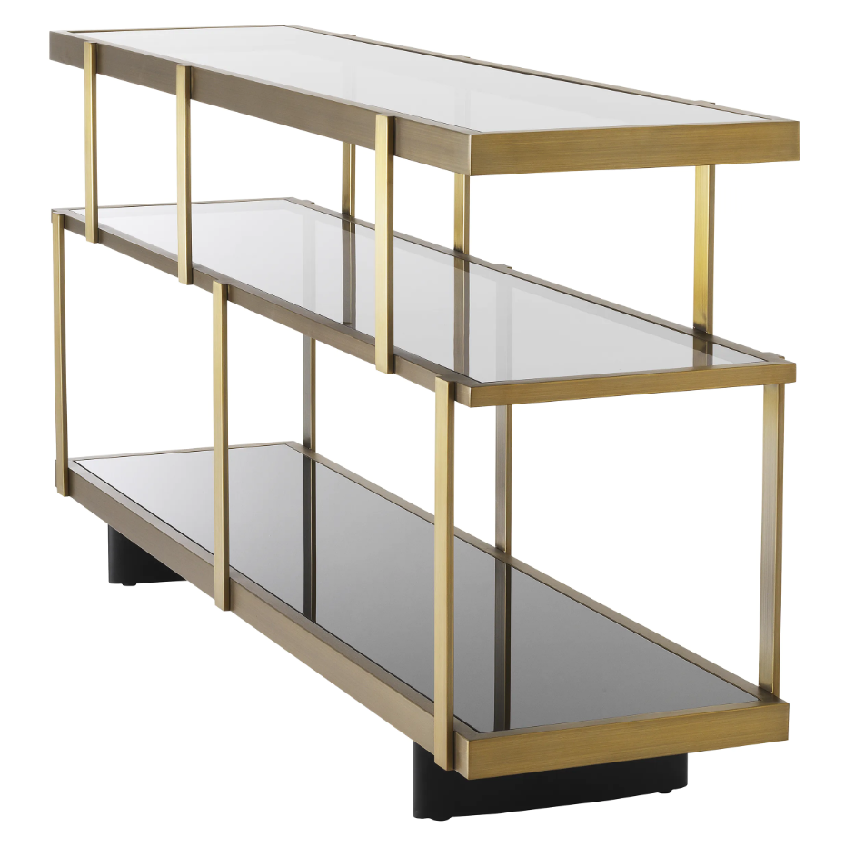 A sophisticated take on industrial style, Dresser Nesto is a wonderful addition to your living room or study. Its stepped carcass has a brushed brass finish and sits on an oak veneer base. Two shelves of smoke glass and a bottom shelf of black glass perfect for putting books, glassware, crockery and personal artifacts on display.