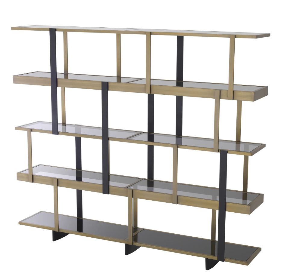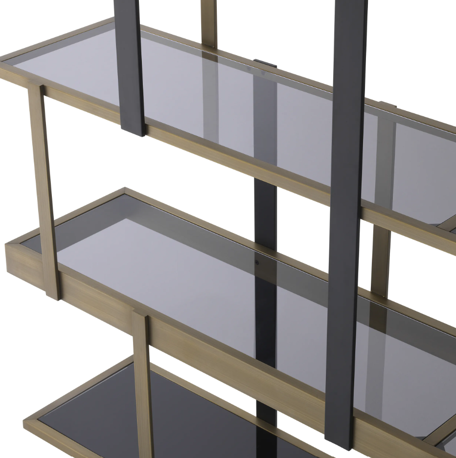 Oferiți cărților, plantelor și accesoriilor dvs. de casă o casă în dulapul modern Mercure. Această unitate mare de depozitare practică se potrivește cu toate stilurile de decor moderne și va atrage ochiul în livingul dvs., unde poate servi și ca separator de cameră. Finisat parțial în alamă periată și parțial în negru, cadrul său robust din metal conține patru rafturi din sticlă fumurie și un raft inferior din sticlă neagră.