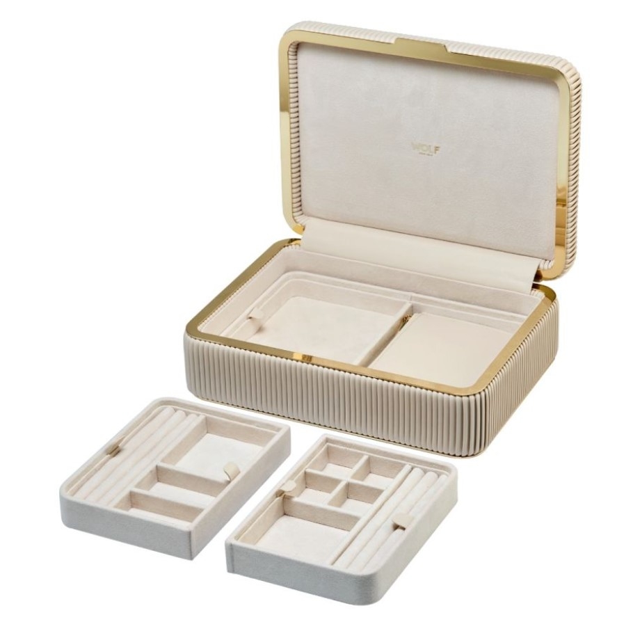 Cutia de bijuterii Bella impresionează prin rafinament și atenție la detalii. Capacul din piele vegană netedă și părțile laterale perfect plisate se armonizează elegant cu finisajele interioare aurii și accesoriile metalice. Interiorul conține trei compartimente detașabile, căptușite cu inovația textilă LusterLoc™, care oferă zece spații pentru inele, coliere, brățări și cercei. De asemenea, include o trusă de cosmetice detașabilă din piele vegană, cu separator intern, ideală pentru păstrarea organizată și protejarea bijuteriilor în timpul călătoriilor.