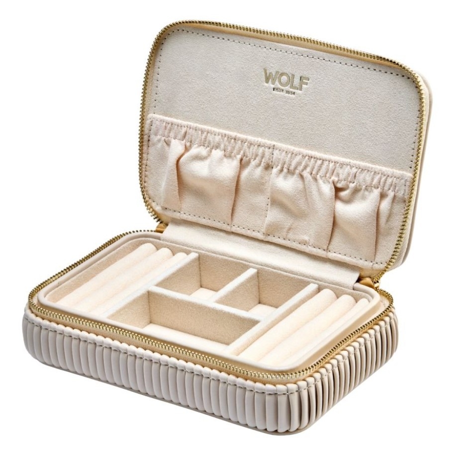 Etuiul pentru bijuterii Bella este expresia eleganței și stilului într-un format compact. Exteriorul neted din piele vegană, lateralele plisate perfect și accesoriile aurii oferă un aspect sofisticat. Interiorul este prevăzut cu trei compartimente căptușite cu materialul LusterLoc™ pentru păstrarea în siguranță a bijuteriilor, două rulouri pentru inele sau cercei, iar pe partea interioară a capacului se află două buzunare elastice pentru obiecte mici suplimentare. Un companion ideal pentru călătorii sau pentru păstrarea organizată acasă.