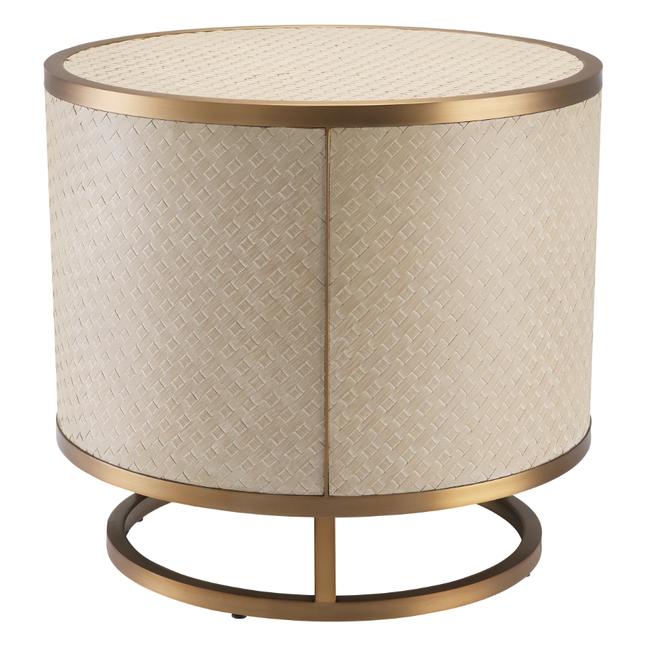 Frumoasa măsuța rotundă Napa Valley oferă stil și funcționalitate înalte pentru zona dvs. de lounge sau dormitor. Căptușită cu furnir de stejar spălat țesut și accentuat de un cadru și feronerie din alamă periată, acest mobilier elegant se potrivește cu multe stiluri de interior.
