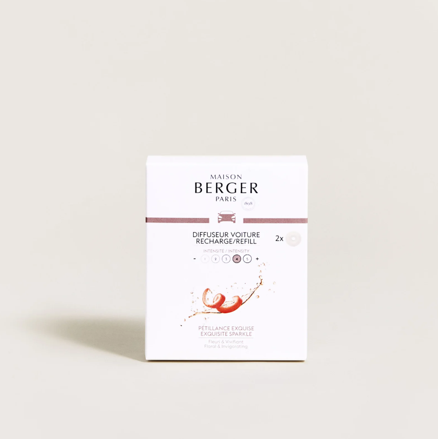 A small, round accessory; a diffuser that releases a few well-chosen aromas in your car. The Exquisite Sparkle fragrance begins with the joyful citrus notes of grapefruit. The sweet and floral heart of patchouli then develops. Elegance and exaltation take over with the gushing scents of sparkling amber wine...