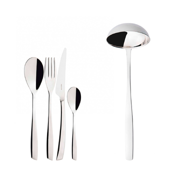 Tacâmurile Riviera din oțel inoxidabil 18/10 au un design minimalist, dar rafinat. Fiind elegante, cu mâner asimetric și capăt înclinat, adaugă un accent modern și stilat mesei. Acest set este perfect atât pentru ocazii speciale, cât și pentru utilizarea zilnică, aducând un plus de rafinament în fiecare moment.