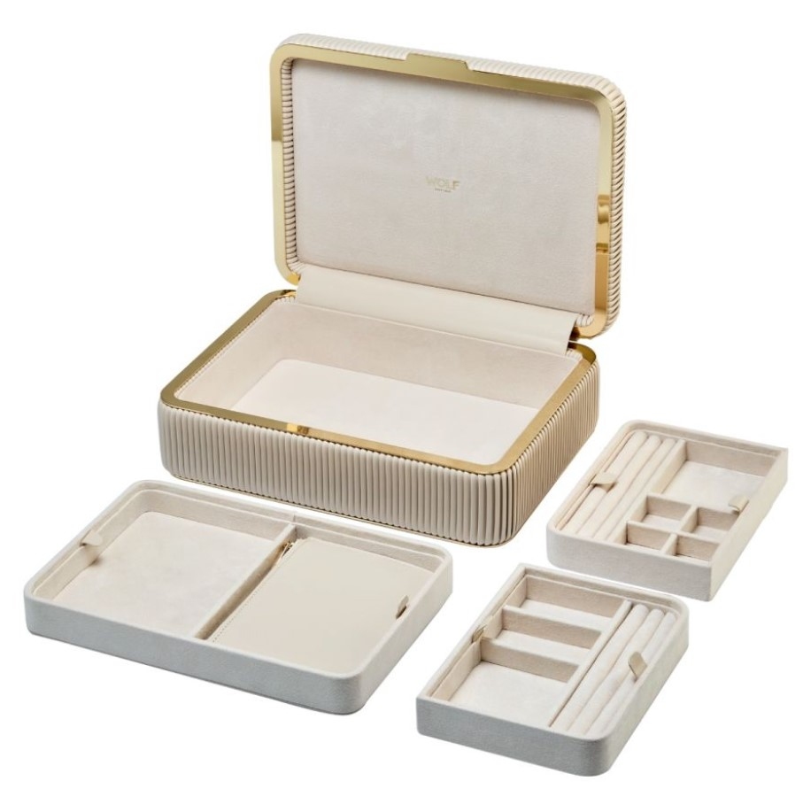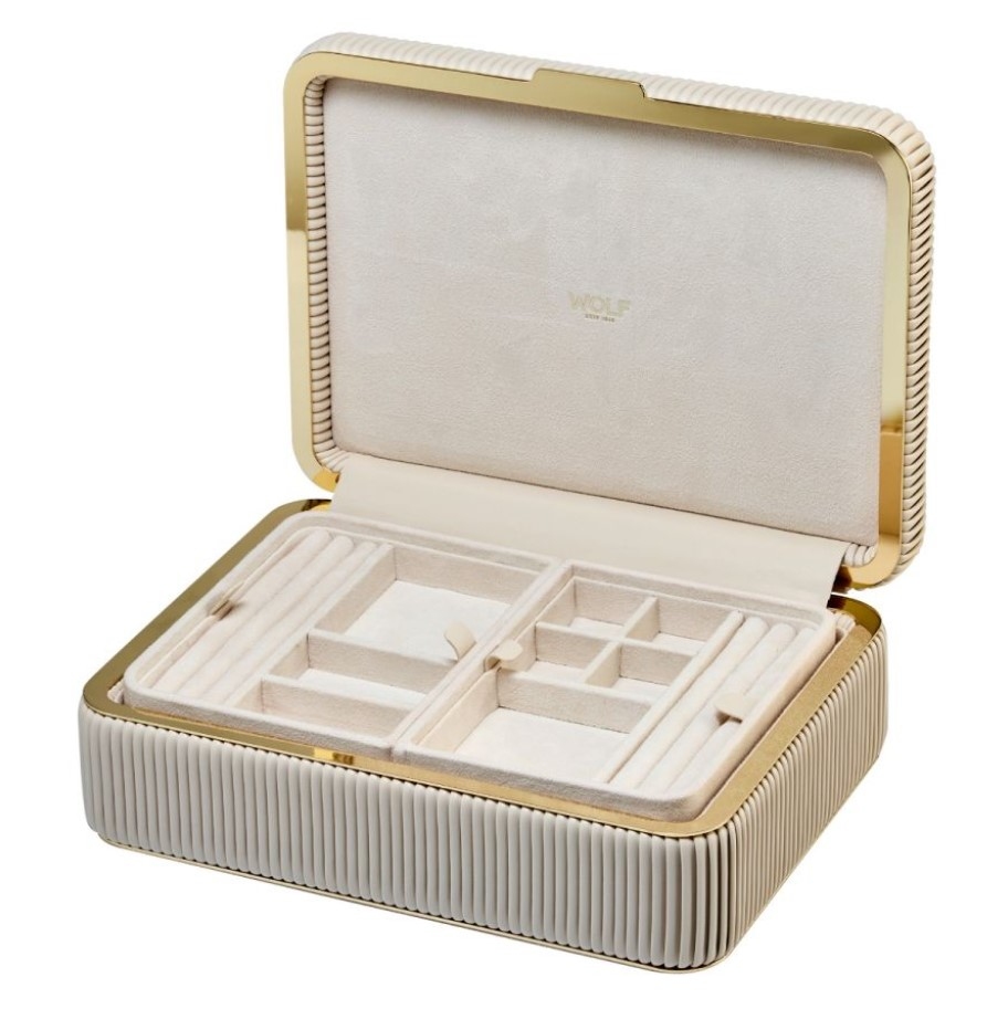 Cutia de bijuterii Bella impresionează prin rafinament și atenție la detalii. Capacul din piele vegană netedă și părțile laterale perfect plisate se armonizează elegant cu finisajele interioare aurii și accesoriile metalice. Interiorul conține trei compartimente detașabile, căptușite cu inovația textilă LusterLoc™, care oferă zece spații pentru inele, coliere, brățări și cercei. De asemenea, include o trusă de cosmetice detașabilă din piele vegană, cu separator intern, ideală pentru păstrarea organizată și protejarea bijuteriilor în timpul călătoriilor.