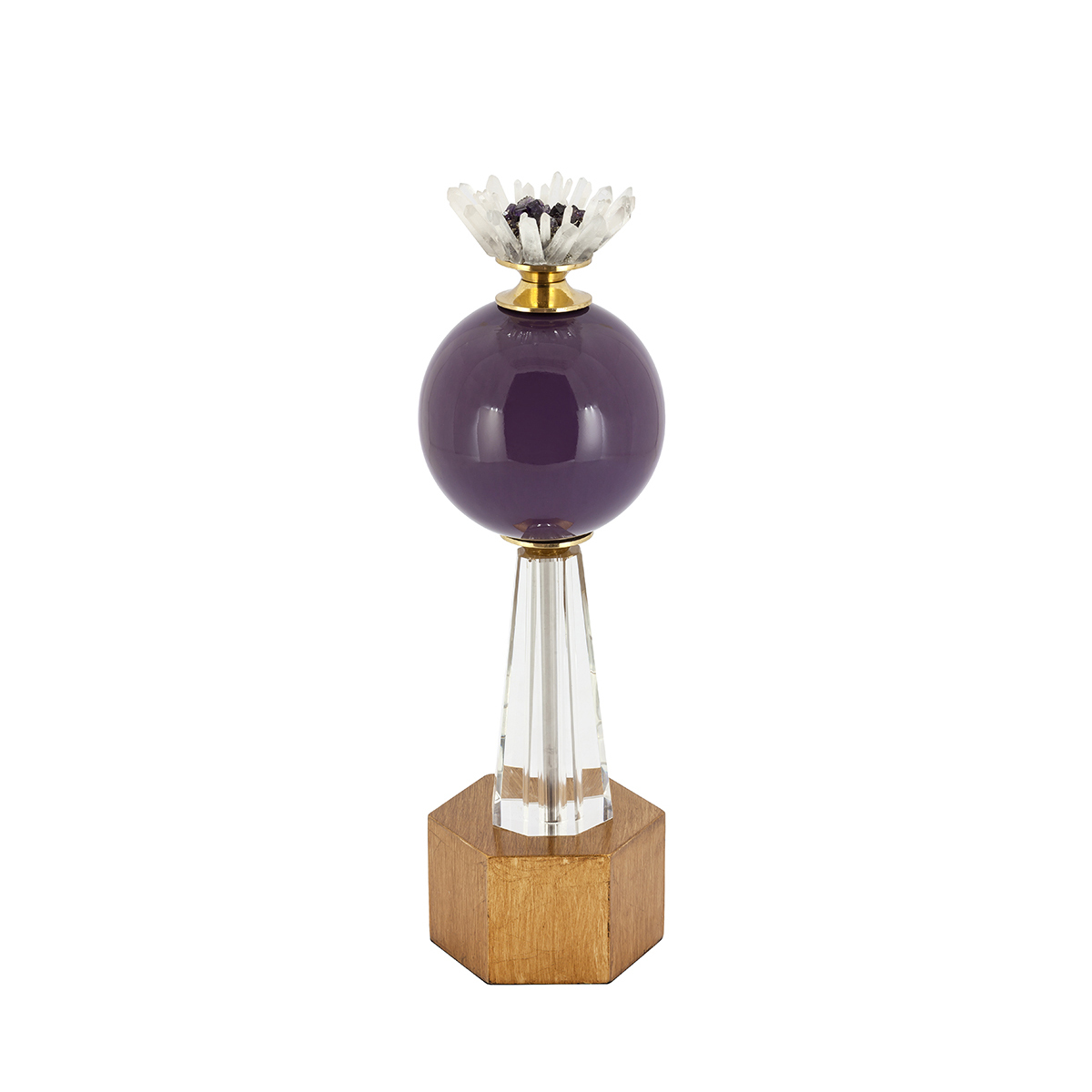 Obiect de decor realizat din sticlă pe o bază din lemn și cu aplicații de minerale și pietre prețioase.