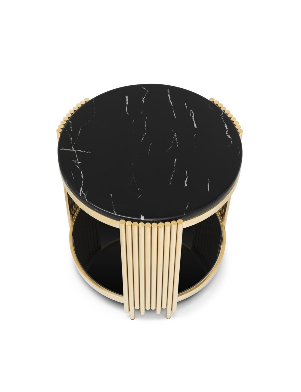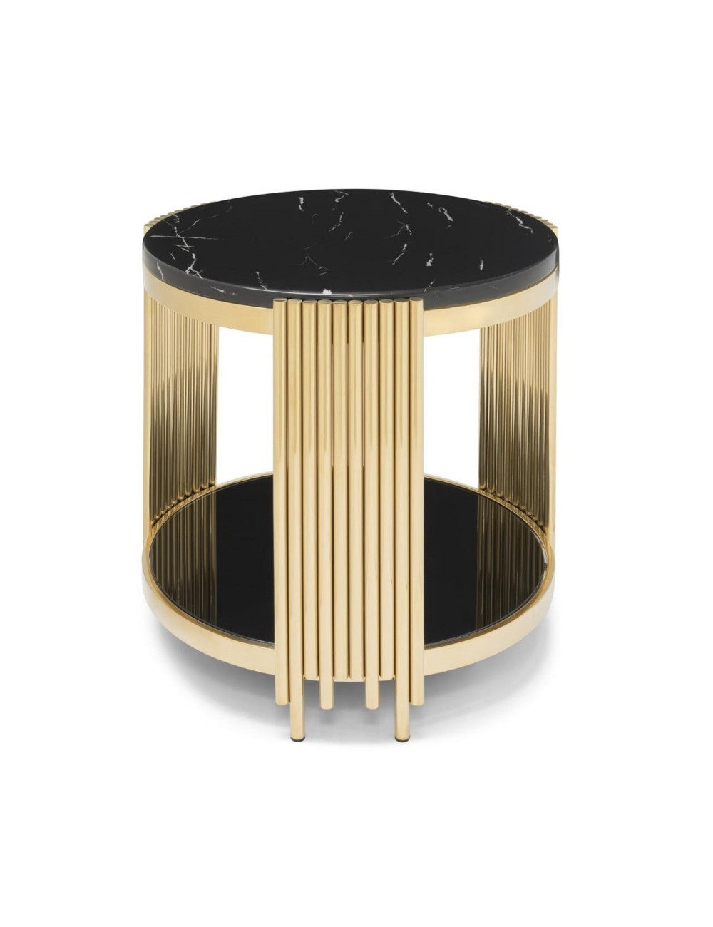 Металлический столик из золотистого хрома с верхней полкой из искусственного мрамора и нижней стеклянной полкой. Информация о товаре